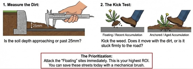 3. Category 3 (The Trap): Soil 11–25mm (Aged). Roots have anchored into the tarmac. You have missed the chronological window. Action: You are now managing a structural defect, not a weed problem.