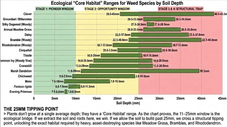2. Category 2 (The Opportunity): Soil 11–25mm (Recent). The herbaceous weed boom (dandelions, meadow grass). Roots are established but "floating." Action: URGENT MECHANICAL RESET. You can still remove the problem successfully.